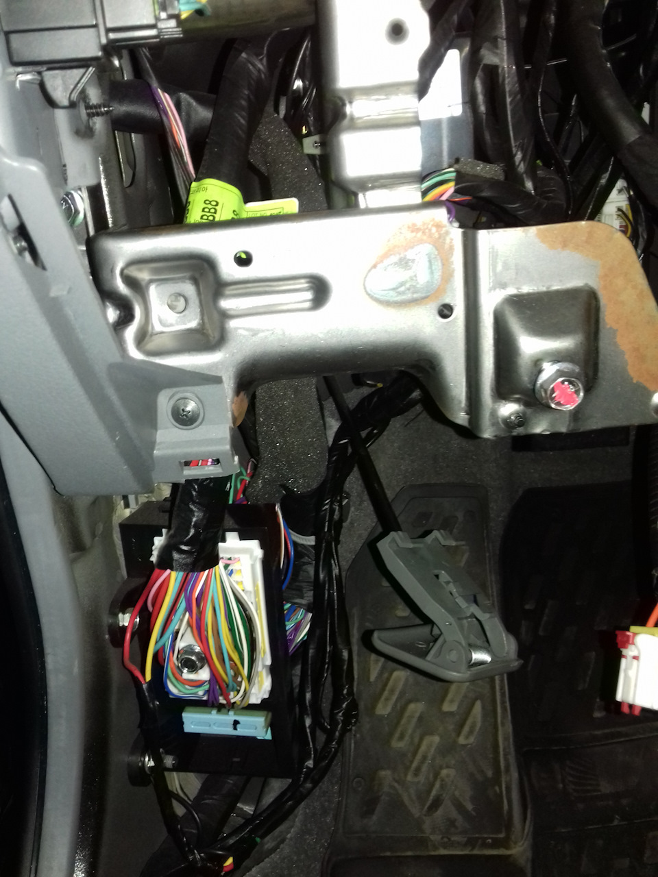 - Откручиваем металлический кронштейн под рулевой колонкой.